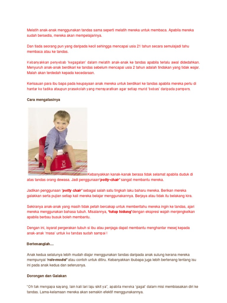 341 hits Mesti semua ibu berfikir bila masa yang sesuai nak hentikan anak kecil dari memakai pampers Setahun setahun setengah atau pun dua tahun Sebenarnya tidak ada umur yang khusus untuk mengajar anak kecil buang air sendiri di toilet Walaupun ada. Di sini kami akan kongsikan satu kaedah yang dikatakan sangat berkesan.
