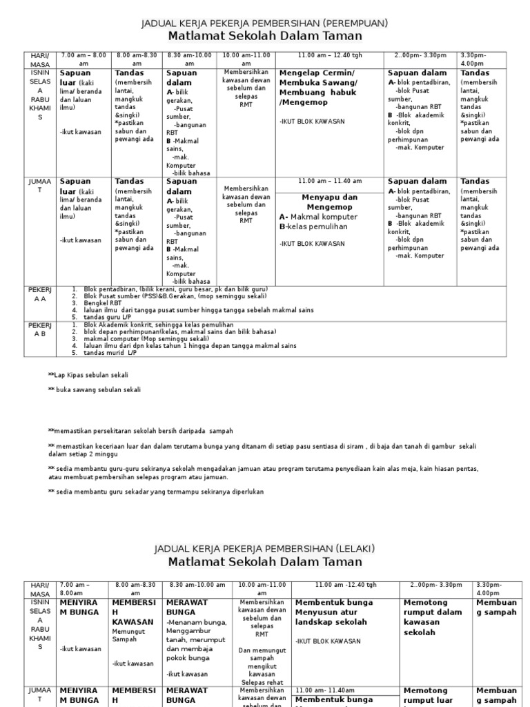Jadual kerja pekerja pembersihan perempuan matlamat sekolah dalam taman hari masa isnin selas a rabu khami s 700 am 800 am. Kerja kerja pencucian di 9 unit kedai pejabat 3 tingkat dan kawasan sekitar taman wakaf seetee aisah di atas lot 1444 mukim 4 jalan tun hussein onn seberang perai tengah ppinang. Related image with contoh jadual kerja pembersihan pejabat.
